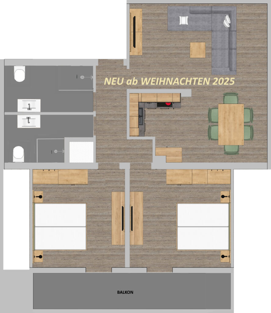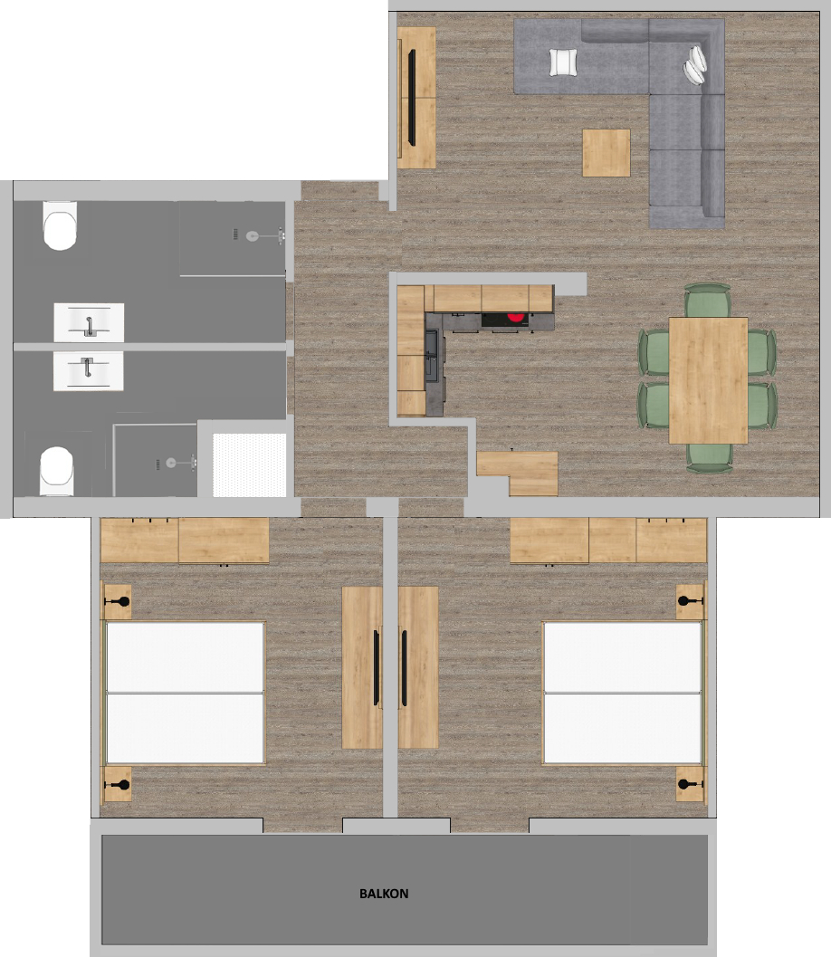 Wohnzimmer mit Küche, 2 Schlafzimmer, 2x Dusche/WC | Grösse ca. 80m²